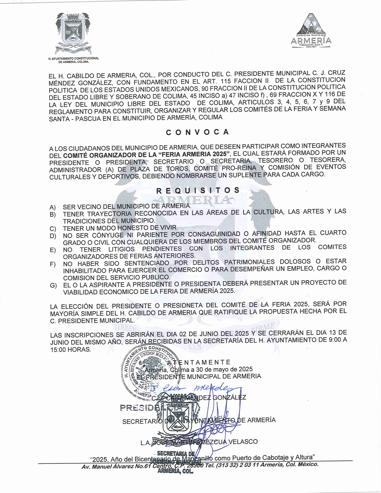 Av. Manuel Álvarez No. 61, Col., Centro, Armería, Col C.P 28300 Tel 313 32 2 09 13 Email: secretaria.armeria@gmail.com – presidencia.armeria@gmail.com